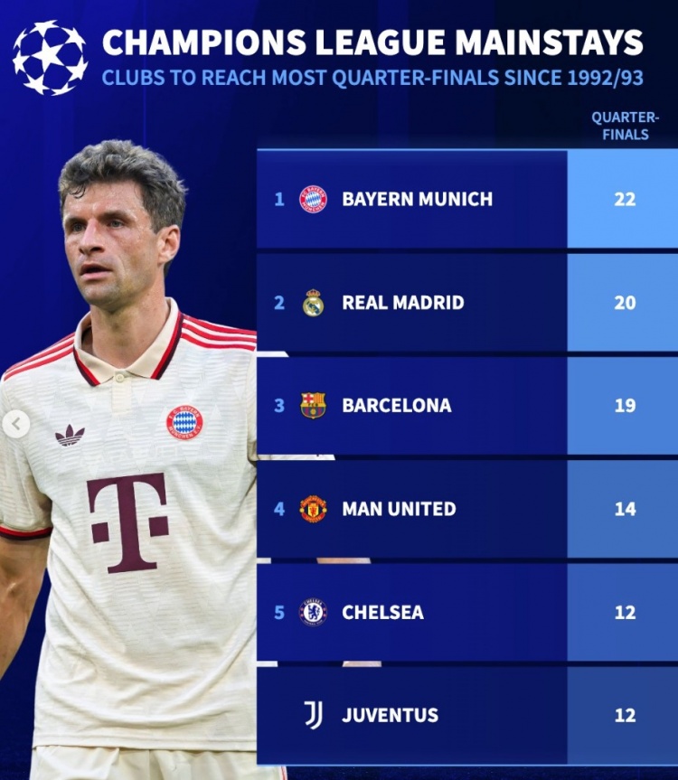 改制后晉級歐冠八強次數(shù)榜:拜仁22次居首,皇馬20次、巴薩19次